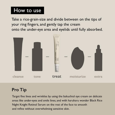 Haruharu Wonder Black Rice Bakuchiol Eye Cream (20ml) is formulated to enhance the eye area by diminishing the appearance of wrinkles and fine lines. This cream blends plant-derived retinol alternative Bakuchiol with moisturising Korean Black Rice Extract and antioxidant-rich Bamboo Shoot Extract for effective care. Leveraging Ultra-Deep Technology, this milky, lightweight cream absorbs quickly without any stickiness and ensures active ingredients are efficiently absorbed by the skin.