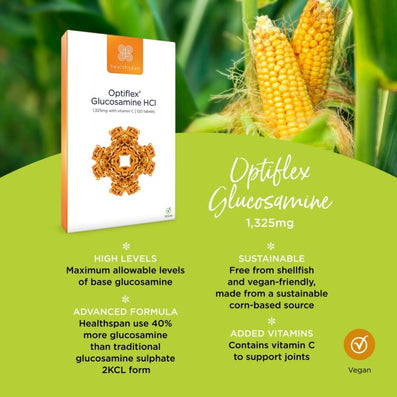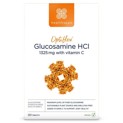 Healthspan Optiflex Glucosamine HCI 1325mg with Vitamin C (120 Tablets) is a vegan Glucosamine supplement, containing the maximum allowable strength as recommended by experts. Glucosamine is found naturally in the human body, where it acts as a building block for the proteins that make joint cartilage.