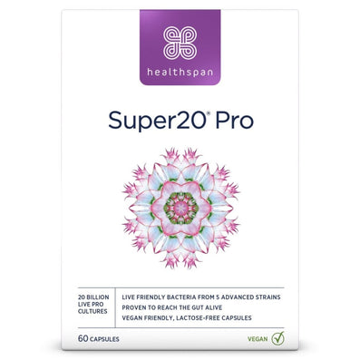 Healthspan Super20 Pro (60 Capsules) combines 20 billion friendly bacteria from five intensely researched strains that have been specially selected to support the protective microflora in the gut. It is ideal for those who want to promote live 'friendly' bacteria in their gut.