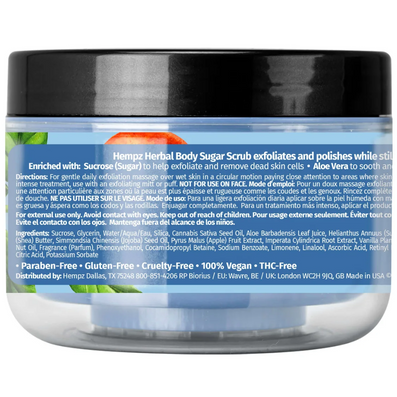 Enriched with 100% pure Hemp Seed Oil, this scrub promotes a healthy, radiant glow. The soothing power of Aloe Vera hydrates and calms, while its antibacterial properties help protect your skin. Shea Butter deeply replenishes moisture, leaving your skin feeling nourished and velvety. The refreshing Grapefruit scent, complemented by hints of Peach, Mandarin and Orange Flower, will leave your skin delicately fragrant and rejuvenated. Free from paraben and gluten. Cruelty-free & vegan-friendly.