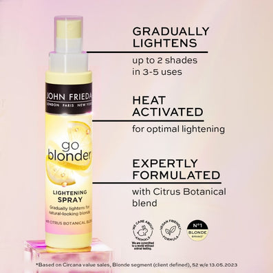 John Frieda Go Blonder Lightening Spray (100ml) is designed to be used in combination with heat to permanently lighten blonde hair by up to two shades, leaving natural-looking blonde hair. Expertly formulated for use on natural and colour-treated blonde, highlights and lowlights, it has been developed with professional colourists to deliver natural-looking, brighter blonde hair with results starting after just a single use.