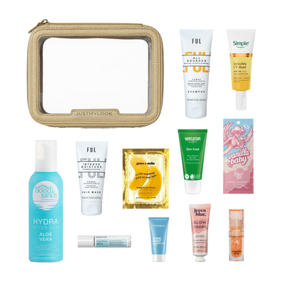 From hydrating skincare and SPF to post-sun soothers and glow-enhancing picks, it's the ultimate travel companion, all neatly housed in a sleek Justmylook travel bag.