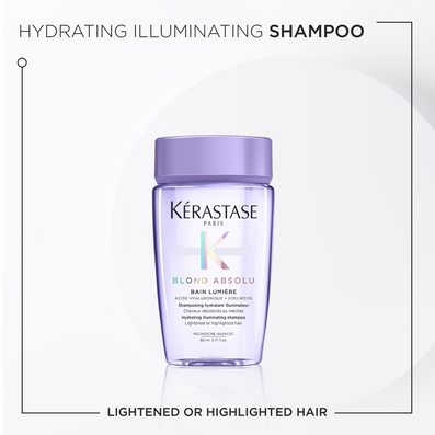 - 1 x Kérastase Blond Absolu Bain Lumiere Hydrating Illuminating Shampoo (80ml) - a hydrating, illuminating shampoo for lightened, highlighted or grey hair which gently cleanses each fibre, leaving the hair light and luminous. Soothing and hydrating from root to tip, it creates a lightweight texture and brightens blond tones. Formulated with Edelweiss Flower Extract, it is rich in antioxidants, protecting the hair from pollution and removes dulling agents. Hyaluronic Acid deeply hydrates the hair, strengthening fibres to prevent breakage. Ultra-Violet Pigments neutralise and remove brassy & yellow undertones, revealing a radiant natural shine.