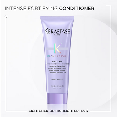 - 1 x Kérastase Blond Absolu Cicaflash Fluide Miracle Intense Fortifying Treatment (75ml) - an opalescent, restorative gel treatment for use on lightened, highlighted and sensitised hair. It intensively nourishes the hair fibre, preventing breakage and producing smooth, hydrated hair without adding excess weight. Formulated with Edelweiss Flower Extract, it is rich in antioxidants, protecting the hair from pollution and removing dulling agents. Hyaluronic Acid deeply hydrates the hair, strengthening fibres to prevent breakage and facilitating detangling from roots to ends. Used together with Blond Absolu Bain Lumiere, it produces 8 times more shine and increases hydration by 92%. Used together with Blond Absolu Bain Ultra-Violet, it makes the hair 16 times more resistant to breakage.
