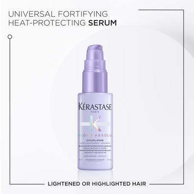 - 1 x Kérastase Blond Absolu Cicaplasme Leave-In Cream (50ml) - a lavender-coloured, fortifying leave-in cream for use on lightened, highlighted and sensitised hair. It intensively nourishes the hair fibre, sealing split ends and producing long-lasting frizz control. Formulated with Edelweiss Flower Extract, it is rich in antioxidants, protecting the hair from pollution and removing dulling agents. Hyaluronic Acid deeply hydrates the hair, Strengthening fibres to prevent breakage and facilitating detangling from roots to ends. Formulated with thermal protection up to 230°C, it can be heat-styled, although primarily intended for air-drying.