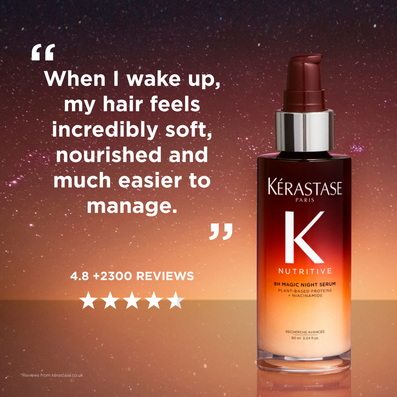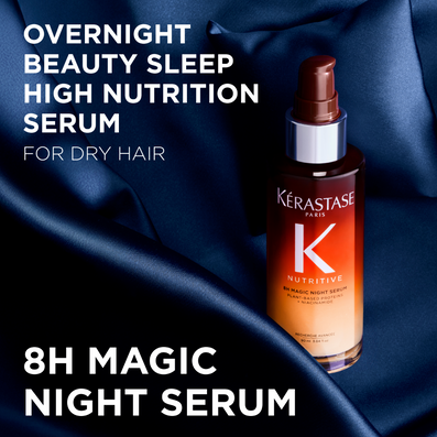 Kérastase Nutritive 8H Magic Night Serum (90ml) is an overnight serum for dry hair, leaving it feeling smooth for up to 8 hours. This overnight hair treatment with a lightweight texture has been enriched with anti-dryness polymers for immediate care. It works for up to 8 hours to smooth and strengthen dry hair, protecting it from pillow friction and the resultant frizz and extra volume. It effectively increases shine, strength and softness.