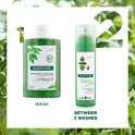 - Shake well and spray from 30cm onto the hair, applying section by section. Leave for 2 minutes to absorb excess sebum.