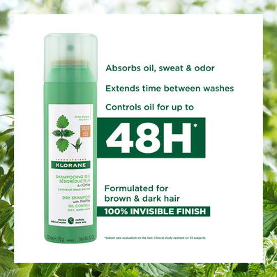 Klorane Purifying Tinted Dry Shampoo with Nettle for Oily, Brown/Dark Hair (150ml) absorbs excess sebum and increases the length between washes.