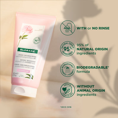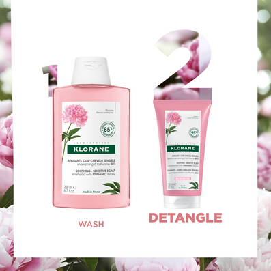 - Shampoo with Klorane Peony Shampoo and apply conditioner to towel-dried hair, distributing over lengths and ends.