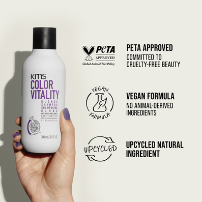KMS Colour Vitality Blonde Anti-Brass Shampoo (300ml) is a newly-formulated, sulphate-free shampoo which prevents colour fade and combats brassiness in straight to coily, blonde hair, weightlessly hydrating to ease detangling threefold. Gently cleansing, it effectively neutralises unwanted warm tones, keeping blonde tones cool. Restoring shine and protecting the vibrancy of colour-processed hair, it effectively maintains colour for up to 20 washes.
