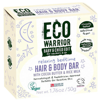 Little Soap Company Eco Warrior Baby & Child Relaxing Bedtime Hair & Body Bar (50g) is a bedtime hair and body bar crafted with Cocoa Butter, Coconut Oil, and Rice Milk to gently nourish skin and hair. Infused with allergen-free Lavender Blossom for a soothing fragrance, it is ideal for sensitive skin. Cocoa Butter enhances skin moisture, while Coconut Oil supports skin health with its anti-inflammatory properties. Rice Milk soothes and moisturises.