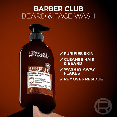 L'Oreal Paris Men Expert Barber Club 3-In-1 Beard, Face & Hair Wash (200ml) is a versatile daily cleanser designed to care for your beard, face, and hair in one simple step. Enriched with natural Cedarwood Essential Oil, the formula gently but effectively washes away impurities, excess oil, and residue while remaining kind to the skin and hair.