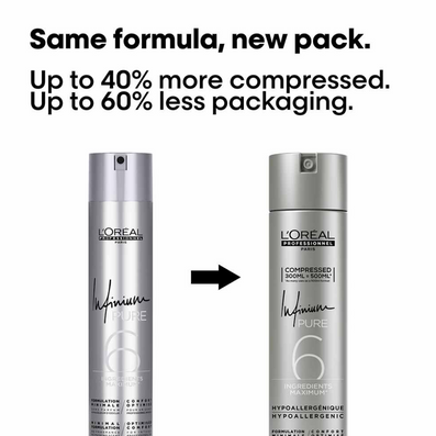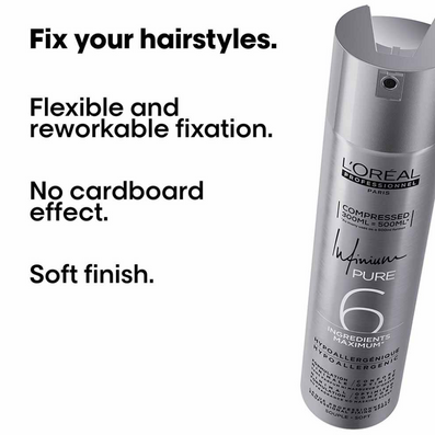 L'Oreal Professionnel Infinium Pure 6 Extra Strong Hairspray (300ml) is a fragrance-free, hypoallergenic hairspray designed for professionals who prioritise both performance and safety. With its extra strong compressed formulation, this 300ml delivers the same number of applications as a standard 500ml fill, making it a cost-effective choice for heavy professional use. Formulated with a strict minimum of just 6 functional compounds, it eliminates fragrance, masking scents, and sensitising agents, ensuring unrivalled comfort while minimising the risk of allergic reactions.