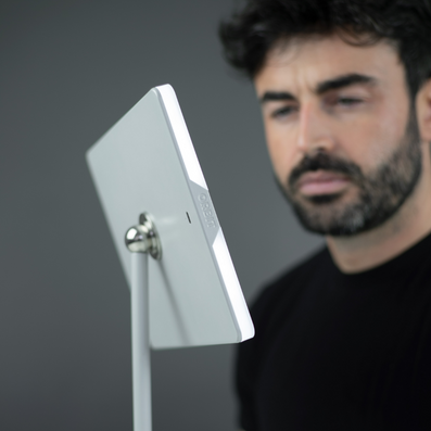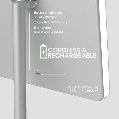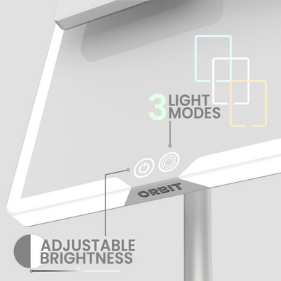Crafted from streamlined aluminium and completely cable-free, its tall structure features a generous 11'' high-definition mirror face powered by a long-lasting 4000mAh rechargeable battery. An integrated dimmable ring light allows you to switch between three lighting tones - Soft Warm, Neutral White and Natural Daylight - ensuring perfect illumination at any time of day. The innovative 360° multi-rotational magnetic ball mount lets you tilt, turn and rotate the mirror into any position, portrait or landscape, and you can even detach the mirror face for handheld use to achieve precise angles for hairstyling or makeup application. Also included is the Mini Orbit 7X magnifying mirror, which magnetically attaches when you need intricate detailing such as brow shaping, skincare or precise touch-ups, complete with its own lighting modes and soft-touch controls for effortless brightness adjustments.