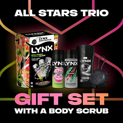 Lynx All Stars Body Wash & Body Spray Trio Gift Set includes a body wash, a body spray, an anti-perspirant and body scrub, making it the perfect gift set for any occasion.