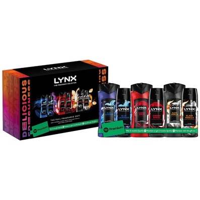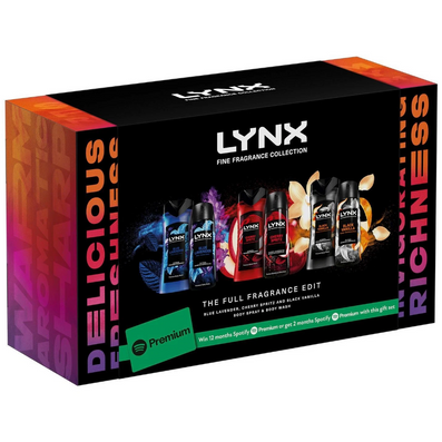 Lynx Fine Fragrance The Full Fragrance Edit is a six-piece gift set that brings together three premium deodorant body sprays with their complementary body washes. Designed to provide lasting freshness and high-definition fragrance, this set blends style, practicality and performance, making it an ideal gift for everyday confidence and care. This set also comes with a chance to win 12 months of Spotify Premium, or 2 months of guaranteed Spotify Premium!