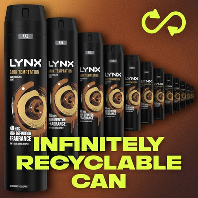 This is the type of chocolate that won't melt away when things get hot. This aerosol bodyspray fights odour-causing bacteria so you can avoid odour and smell irresistible for 48 hours. Same classic Lynx Dark Temptation scent, fresh new look. This great-smelling Lynx deodorant aerosol comes in an infinitely recyclable can - fresher you, cleaner planet. Cruelty-free.