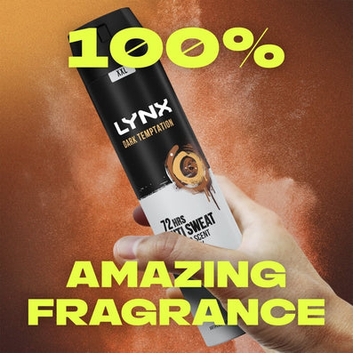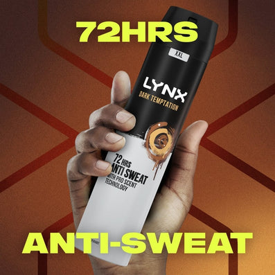 Lynx XXL Dark Temptation 72h Dark Chocolate Anti-Perspirant Deodorant Spray (250ml) with 72-hour anti-sweat protection prevents odour and wetness before it starts, Lynx Dark Temptation Antiperspirant Deodorant guarantees dryness whilst depositing its smooth Dark Chocolate, high definition fragrance.