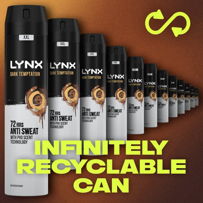 Same exhilarating Lynx Dark Temptation fragrance, fresh new look. Banish odour and smell fresh for 72 hours with this dual-action anti-perspirant, keeping underarms fresh and dry. This great-smelling Lynx deodorant aerosol comes in an infinitely recyclable can - fresher you, cleaner planet. Cruelty-free.