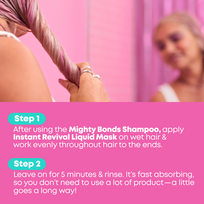 - After using the Mighty Bonds Shampoo, apply the Instant Revival Mask on wet hair and work evenly throughout the hair until the ends. Only a small amount is required.