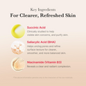 The multi-acid formula combines Succinic Acid, Salicylic Acid (BHA) and Glycolic Acid (AHA) to lift dead skin cells, dissolve congestion and improve overall tone. Niacinamide helps brighten and even the complexion, while Panthenol works to calm visible redness and support the skin barrier. Formulated within a skin-friendly pH range of 3.5 to 5.5, the pads feel lightweight and refreshing on the skin without stickiness. Dermatologist-tested and non-comedogenic, they are free from artificial colours and fragrances and suitable for teens and adults managing persistent breakouts. Cruelty-free & vegan-friendly.