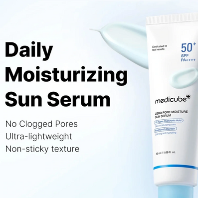 Medicube Zero Pore Moisture Sun Serum PA++++ SPF50+ (50ml) is a lightweight, serum-textured sunscreen designed to deliver high-level UV protection while keeping the skin hydrated and balanced. Created with a breathable, non-greasy formula, it glides effortlessly onto the skin, leaving a smooth, fresh finish with no white cast or residue, making it ideal for daily wear.