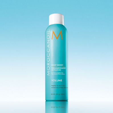- Shake can well. Spray Moroccanoil Root Boost generously on towel-dried hair at the roots.