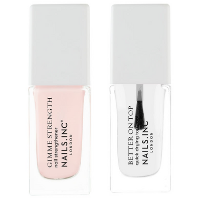 Nails Inc. Gimme Strength & Better On Top Mini Nail Treatment Duo (2 x 8ml) offers two nail treatments from Nails. Inc, formulated to strengthen nails and leave them with a healthy-looking shine.