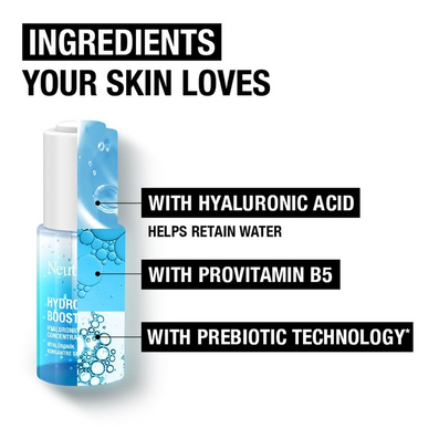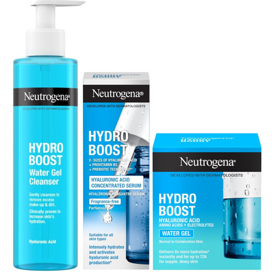 - 1 x Neutrogena Hydro Boost Hyaluronic Acid Concentrated Serum (15ml) - intensely hydrates the skin and stimulates the production of Hyaluronic Acid. Formulated using two varieties of Hyaluronic Acid of differing molecular weights, 100% plant-based trehalose and Provitamin B5, this nourishing serum provides intense moisture for smoother skin in just two weeks. Fragrance-free and suitable for all skin types. including sensitive skin.