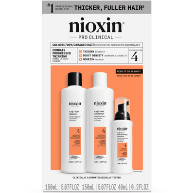 Nioxin System 4 Hair Starter Kit for Coloured Treated Hair with Progressed Thinning is a complete haircare system comprising 3 professional products specially formulated to improve the structure and prevent breakage in colour-treated hair suffering from progressed thinning. The system effectively cleanses, refreshes the scalp, reduces hair loss and leaves the hair looking thicker with glossy shine.
