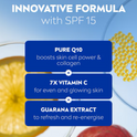 Enriched with Vitamins C, E, and 100% skin-identical Q10, it reduces the appearance of fine lines in just 2 weeks as well as firming skin. It reduces dullness and alleviates signs of tiredness. Vitamin C is a natural skin booster and Vitamin E helps to increase skin resilience. This day cream has been formulated with an SPF15 factor offering UVA and UVB protection to prevent solar-induced wrinkle formation. Ensures an instantly refreshed complexion and smooth skin feeling.