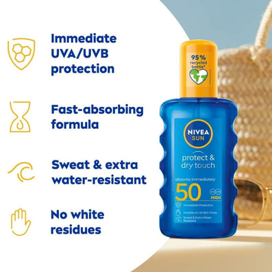 Nivea Sun Protect & Dry Touch Sunscreen Spray SPF50 (200ml) provides highly effective SPF50 protection against sunburn and sun-induced skin damage with no white residue. Specially designed to care for your skin, this transparent spray immediately protects against sun exposure and long-term UV-induced skin damage upon application, and helps to reduce the risk of sun allergies.