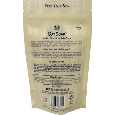 OatSoak Dissolvable Bath Oats (100g) is a dermatologist-recommended oat bath treatment formulated with 100% pure colloidal oatmeal to provide natural relief for dry, itchy and irritated skin. This ultra-fine oat powder dissolves completely in water, creating a soothing, milky bath that leaves no mess or residue.