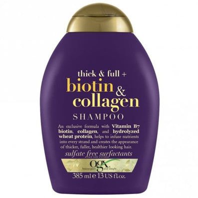 - 1 x OGX Thick & Full Plus Biotin and Collagen Volume Shampoo (385ml) - a volumising blend which helps to thicken and texturise fine hair. It infuses nutrients into every strand and creates the appearance of thicker, fuller hair with added volume. Enriched with Vitamin B7, Biotin, Collagen and Hydrolysed Wheat Protein, it helps volumise even the finest hair types into fuller and more abundant-looking locks.