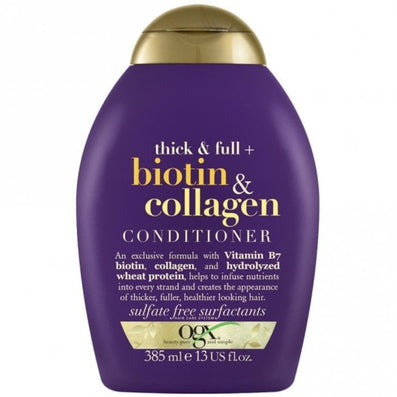 - 1 x OGX Thick & Full Plus Biotin and Collagen Volume Conditioner (385ml) - a volumising blend which helps to thicken and texturise fine hair. It infuses nutrients into every strand and creates the appearance of thicker, fuller hair with added volume. Enriched with Vitamin B7, Biotin, Collagen and Hydrolysed Wheat Protein, it helps volumise even the finest hair types into fuller and more abundant-looking locks.