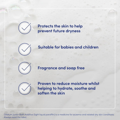 Oilatum Junior Bath Additive for Eczema & Dry Skin (600ml) is a gentle, fragrance-free bath treatment specially formulated to provide relief for babies and children suffering from eczema or dry skin conditions.