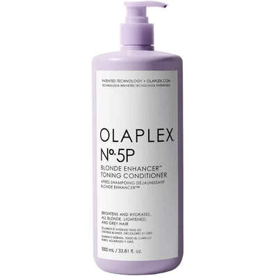 - 1 x Olaplex No 5P Blonde Enhancer Toning Conditioner (1000ml) - a purple conditioner for root-to-tip toning and brightness + patented OLAPLEX Bond Building Technology for strong, healthy-looking blondes and greys. Olaplex No 5P Blonde Enhancer Toning Conditioner is a nourishing powerhouse that delivers comprehensive toning, brightness, and smoothing hydration to every strand, from root to tip. It excels at untangling and softening delicate blonde hair, all without burdening the roots, a common issue with many conditioners. What sets this conditioner apart is its exclusive status as the only purple conditioner featuring the groundbreaking OLAPLEX Bond Building Technology. This technology works wonders, reinforcing the hair's bonds to create robust, radiant blondes and greys. Vegan-friendly.