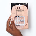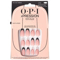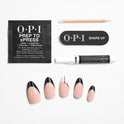 OPI xPress/On Nails My 9 To Thrive (30x) provide an instant gel-like salon manicure with black and white French tip press-on nails in a long, almond shape.