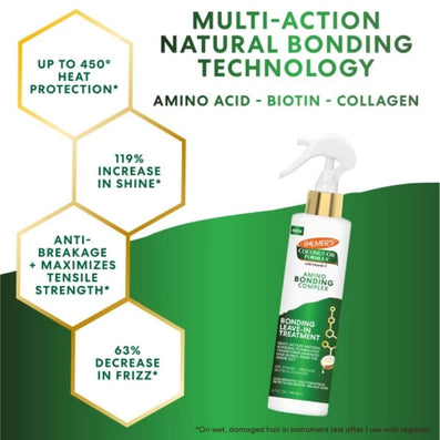 Palmer's Amino Bonding Complex Leave-In Treatment (198ml) is a concentrated, reparative leave-in treatment which has been formulated with a proprietary natural bonding technology to restore and protect hair bonds which have been severely damaged by bleach, colour, chemicals, heat, styling and environmental factors. This highly concentrated, bond-conditioning reparative masque instantly detangles, deeply nourishes and seals in hydration to reverse severe damage. It provides anti-breakage, lasting protection, brilliant shine and softness with up to 230°C heat protection and 63% decrease in frizz.