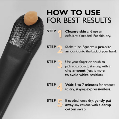 - Shake tube. To control application, squeeze a pea-size amount on the back of your hand first. Using your fingertip or dry makeup brush, take product from back of hand as needed, starting with a tiny amount (less is more, to avoid white residue). Spread onto the eye and brow area.
