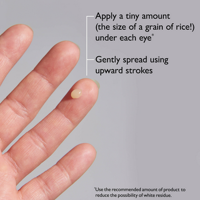 - Shake tube. To control application, squeeze a pea-size amount on the back of your hand first. Using your fingertip or dry makeup brush, take product from back of hand as needed, starting with a tiny amount (less is more, to avoid white residue). Spread onto the eye and brow area.