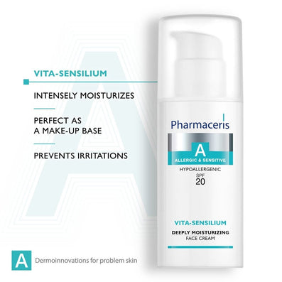 Pharmaceris A Vita Sensilium Moisturising Face Cream SPF30 (50ml) provides daily care for hypersensitive skin prone to allergic reactions, moisture loss and excessive dryness. It has a light, non-greasy texture, absorbs quickly, and does not contribute to clogged pores or comedones. It supplies long lasting hydration, smooths out the skin and restores softness and elasticity.