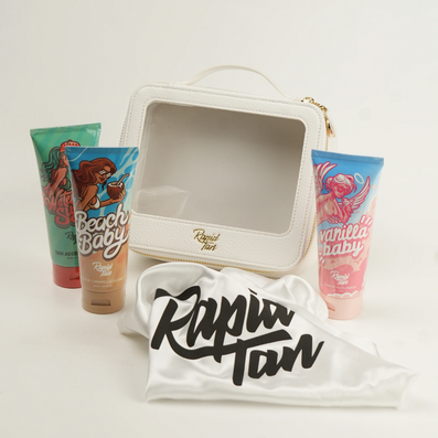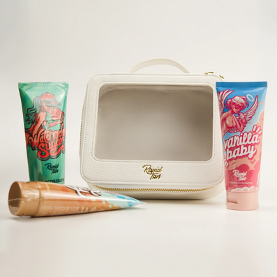 Rapid Tan La Dolce Bronze Luxe Tanning Accelerator Lotion Travel Collection (3 x 100ml) is a luxurious collection of three full-sized Rapid Tan tanning accelerator lotions. Inspired by the elegance of Italian designer craftsmanship, this collection is a limited edition trio that celebrates sun-drenched glamour and timeless beauty. A playful nod to 'La Dolce Vita,' this exclusive set is designed for those who live life radiantly bronzed. Housed in a luxury magnetic keepsake box with a satin travel bag.