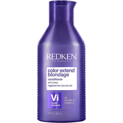 - Redken Colour Extend Blondage Anti-Brass Conditioner (300ml) - a colour-depositing conditioner designed to tone, strengthen & condition blonde hair. Enriched with ultra-violet pigments, this conditioner banishes unwanted brassiness and yellow undertones, making it perfect for blonde, super-lightened, de-coloured or streaked hair. Formulated with Citric Acid, the pH balanced formula repairs and strengthens hair from the core. Featuring Redken's Triple Acid Protein complex, this light purple conditioner helps detangle and smooth processed blonde hair or to condition natural blondes whilst keeping your colour protected. Enjoy bright, luminous locks with salon-worthy shine when using this conditioner.