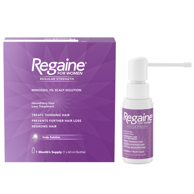 Regaine has been formulated with key ingredient Minoxidil, the only over the counter active ingredient which has been clinically proven to help regrow hair. Working deep at the roots, Regaine Regular Strength Solution works by increasing the supply of blood and nutrients to hair follicles, restoring a thinning parting, helping to strengthen existing hairs, and encouraging thicker hair growth. This pack contains 1 month's supply.