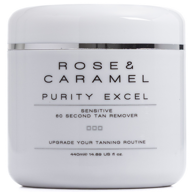 Rose & Caramel Purity Excel Sensitive 60 Second Tan Remover (440ml) is a fragrance-free formula designed for sensitive skin, including eczema and psoriasis, delivering award-winning results in just 60 seconds.
