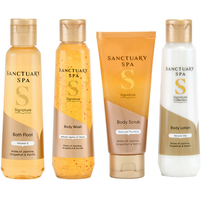 Sanctuary Spa Signature Glow & Go Washbag Set is an attractively presented 4-piece spa gift comprising body wash, body scrub, body lotion and bath float fragranced with the Sanctuary Spa signature scent of Jasmine, Grapefruit and Vanilla to effectively calm the senses.