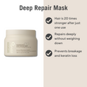 - Apply the deep repair mask evenly on damp, towel-dried hair and leave in for 5-10 minutes.