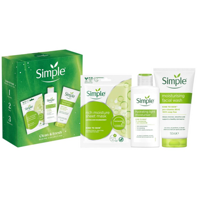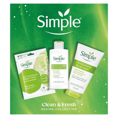 Simple Clean & Fresh Regime Gift Set is a three-step skincare collection created specifically for sensitive skin. Featuring a gentle face wash, a hydrating sheet mask and a lightweight moisturiser, this set delivers a soothing routine that cleanses, hydrates and refreshes the complexion without irritation.
