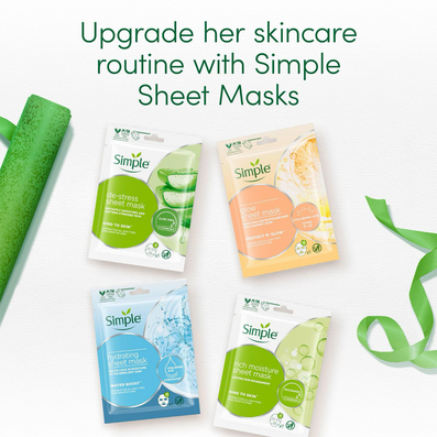 - 1 x Simple Kind To Skin De-Stress Sheet Mask (21ml) - your perfect stress relief at the end of a long day. This Korean-inspired mask is constructed from light, natural fibres that contour to your face seamlessly. Infused with Aloe, a Plant-Based Prebiotic, and skin-loving Vitamins, this mask delivers active nutrients directly to stressed skin to instantly soothe and brighten. The mask is free from artificial perfumes, colours, alcohol, and harsh chemicals that might lead to skin irritation. This dermatologically tested, hypoallergenic formula is ideal for even the most sensitive skin types. PETA-approved. Cruelty-free & vegan-friendly.
